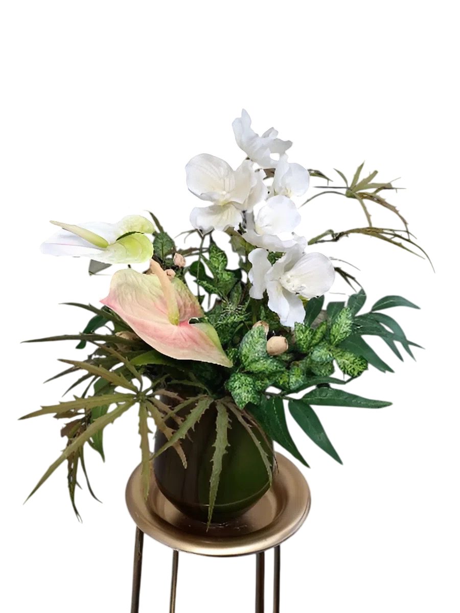 Искусство природы воплотилось в изысканной композиции «Катлея», предназначенной для тех, кому близка атмосфера далеких тропических островов и очарование утонченных форм. Эта уникальная композиция способна стать истинным украшением любого интерьера, наполнив пространство магическим ароматом экзотической гармонии и лёгкостью солнечного света. Созданная руками мастера, композиция гармонично сочетает роскошь природных мотивов с эстетикой лучших традиций декоративного искусства. Искусственные цветы и зелень, искусно подобранные и собранные вручную, создают иллюзию свежести, а особая роль отведена тяжёлым вазам из знаменитого муранского стекла ручной работы, подчёркивающим уникальность каждой линии и оттенка. Настоящий эксклюзив, выполненный исключительно из высококачественных материалов, «Катлея» представляет собой уникальный объект, достойный восхищённых взглядов и внимательного изучения. Каждый элемент композиции продуман до мелочей, создавая неповторимый ансамбль цвета, формы и фактуры. Эта композиция доступна лишь в единственном экземпляре, воплощённом творческим замыслом её создателя. Повторение же столь совершенного сочетания невозможно: каждый новый шедевр неизбежно обретёт свою собственную индивидуальность, отражающую вдохновение и мастерство художника.