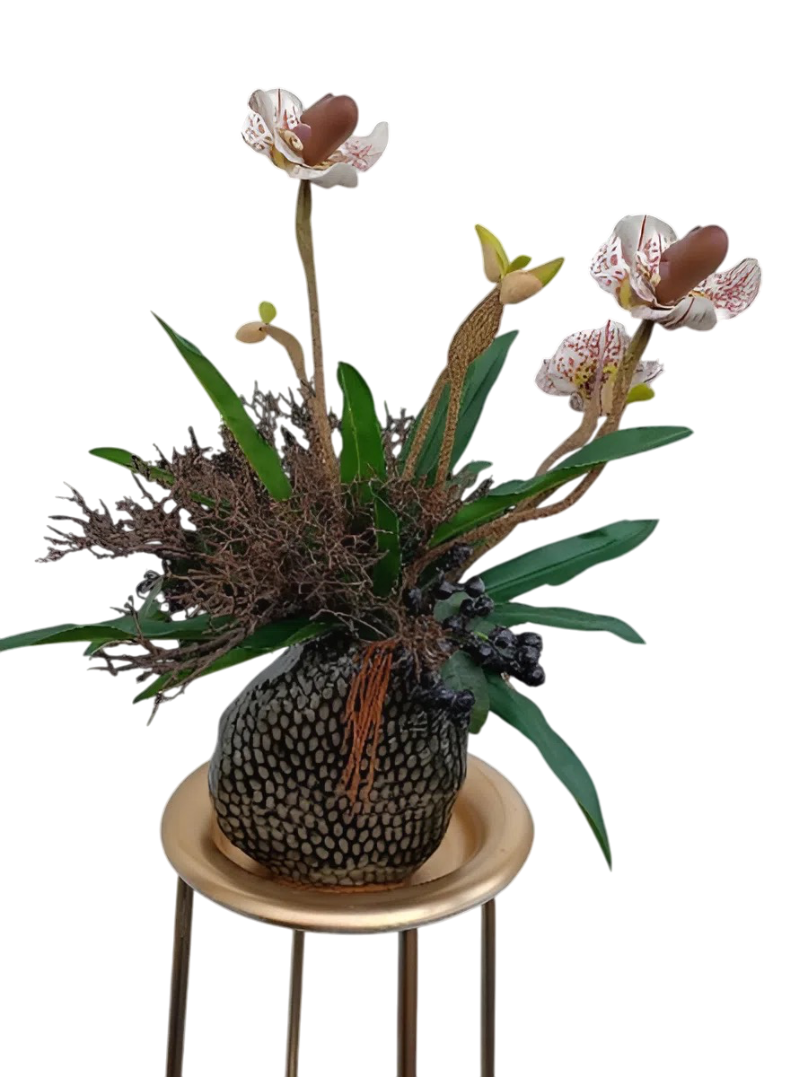 Исключительная красота природы раскрывается в изящной гармонии цветка и формы, рождая настоящее произведение искусства. Эта уникальная композиция способна преобразить пространство вокруг себя, наполнив его очарованием Востока и лёгкостью полёта мысли. Каждая линия подобрана так точно, каждая деталь расположена настолько искусно, что создаётся впечатление живого организма, бережно собранного мастером-флористом. Разнообразие фактур — гладкость лепестков, воздушность ткани и мягкость древесных волокон — подчёркивает природную элегантность и благородство главной героини — нежнейшей орхидеи башмачка. Тонкая игра оттенков создаёт особую атмосферу спокойствия и изысканности, заставляя остановиться, задержать взгляд и насладиться каждой гранью композиции. Только лучшие природные материалы использованы для воплощения мечты мастера. Каждый цветок подобран вручную, каждый элемент продуман и гармоничен. Подобрать такую же уникальную комбинацию цветов и форм практически невозможно, ведь этот шедевр создан единожды и неповторимо. Эта оригинальная работа станет украшением интерьера любого уровня и стиля, подчеркнув вкус и утончённость своего владельца. Единственный экземпляр, авторская работа. Повторение точной копии невозможно!