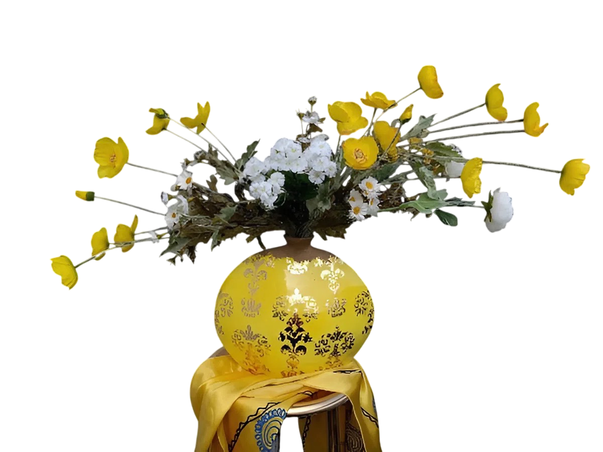 Потрясающая солнечно-тёплая композиция покорит сердце любого ценителя прекрасного, став незабываемым акцентом Вашего пространства. Этот букет – настоящее произведение искусства, созданный специально для тех, кто любит природу, её гармонию и утончённость. Яркая палитра красок оживает в каждой веточке и бутоне, переливаясь красками солнечного света: благородные золотые маки сияют яркими искрами тепла, изящные ароматные ранункулюсы распускают свои белоснежные лепестки, создавая ощущение весеннего цветения, игривые соцветия сантини привносят нотку беззаботности и легкости. Особое внимание привлекает эксклюзивная авторская ваза, выполненная вручную одним из мастеров своего дела, подчеркивающая изысканность каждого цветка и придавая всему произведению особую ценность и индивидуальность. Созданная в единственном экземпляре, эта уникальная композиция хранит тепло рук художника и подарит Вашему дому неподражаемую ауру гармонии и радости.